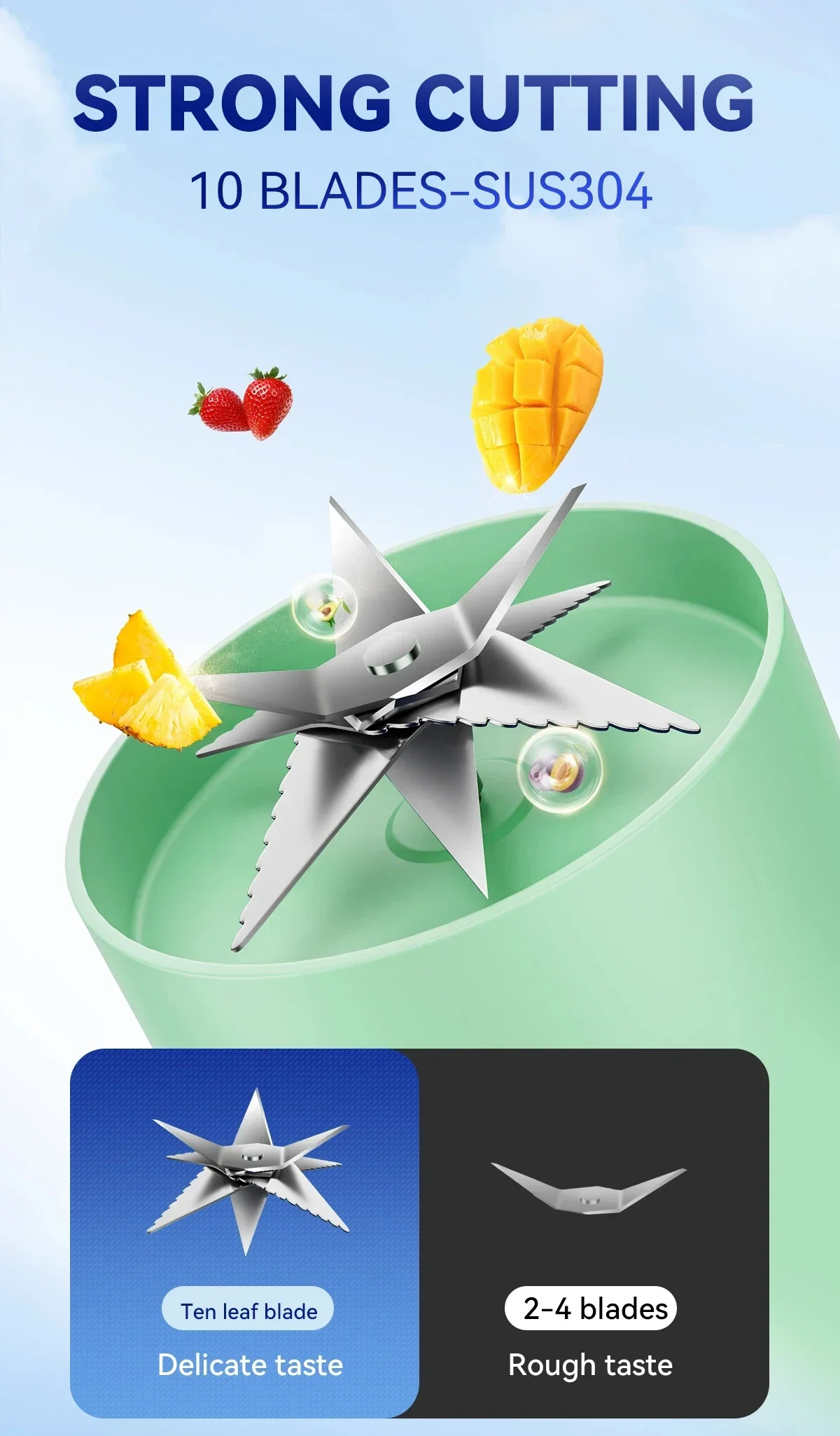 Lamă cu zece lame: Echipat cu o lamă puternică cu zece lame, storcătorul oferă un gust fin și delicat, amestecând perfect fructele și legumele pentru o experiență răcoritoare.