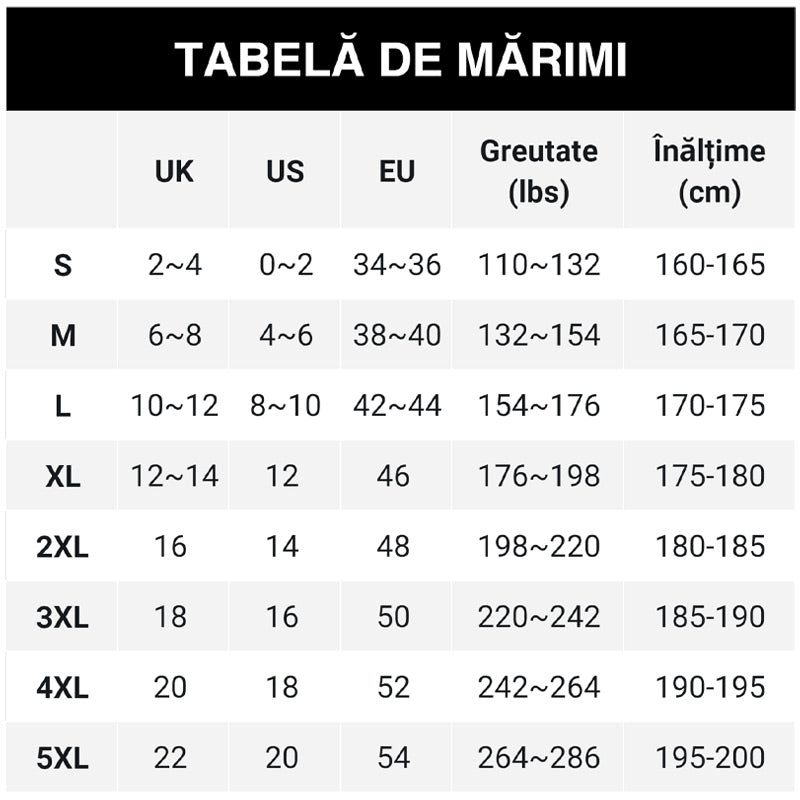 Consultați tabelul de mărimi pentru o potrivire optimă; materialul are puțină elasticitate.