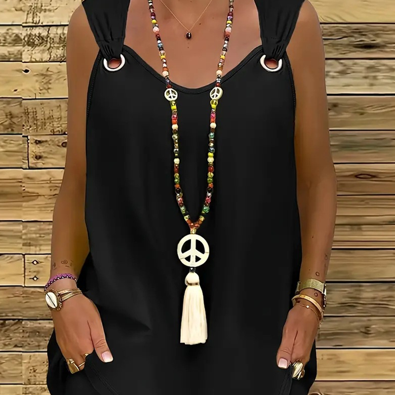 DESIGN ELEGANT FĂRĂ MÂNECI CU DETALII PE UMERI: Topul fără mâneci are un decolteu în V rafinat și inele rotunde distinctive pe umeri, care adaugă dimensiune și fler modern. Acest detaliu elevat trece fără efort de la ținutele casual de zi la evenimentele de seară de vară, oferind versatilitate cu o margine modernă.