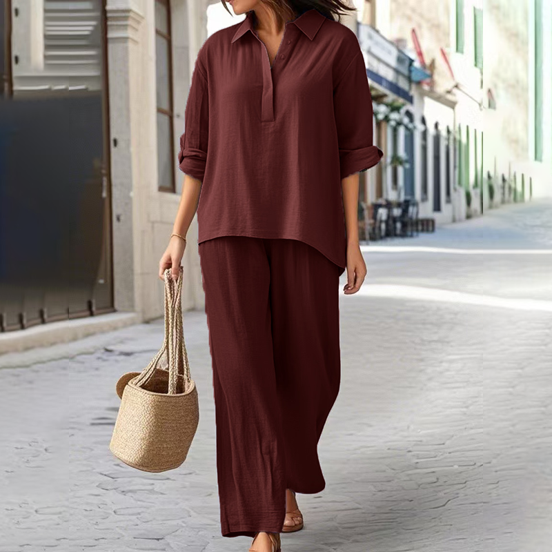 POTRIVIRE RELAXATĂ PENTRU CONFORT PE TOT PARCURSUL ZILEI:Cămașa cu croi lejer și pantalonii cu picioare largi oferă o siluetă relaxată care permite o mișcare ușoară, fără a se simți strânsă sau restrictivă.